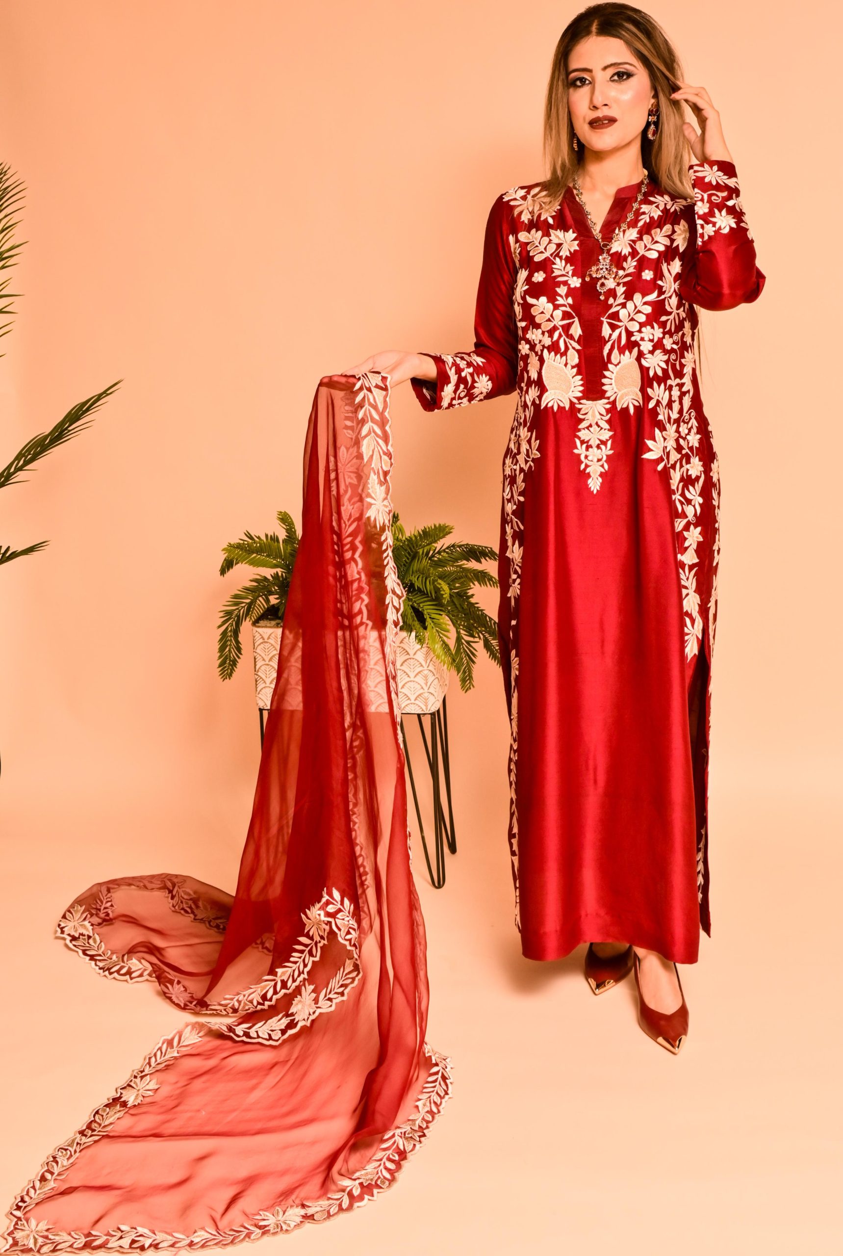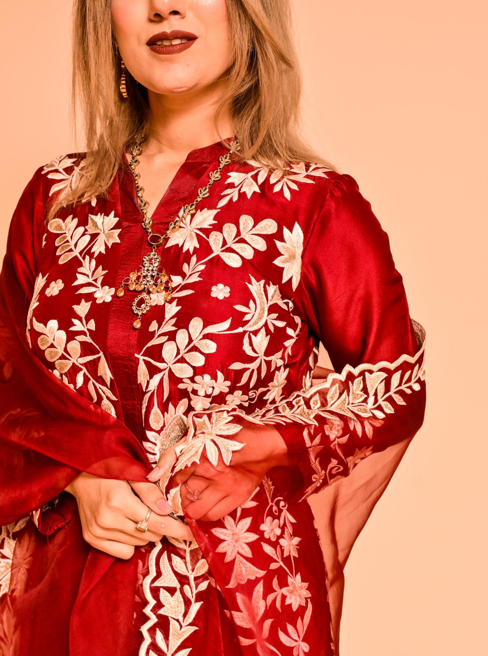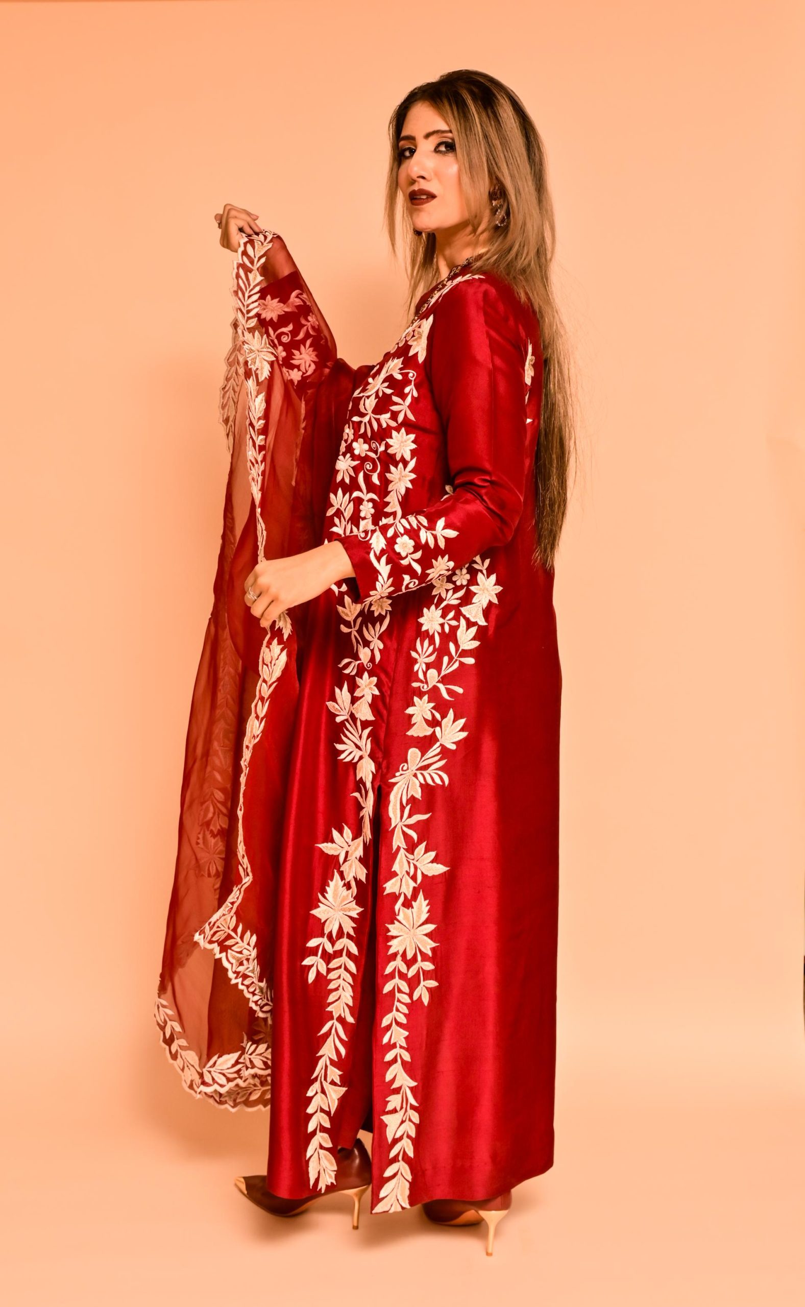 The Crimson Arabesque is a timeless formal ensemble crafted in pure raw silk, designed to embody regal elegance with a Middle Eastern flair. Inspired by intricate Arabic motifs, this deep crimson outfit features flowing vine and floral embroidery in soft ivory threads, artfully placed along the front panel, sleeves, and borders. The look is completed with a matching organza dupatta, adorned with arabesque-inspired embroidered edges that lend a touch of sophistication and grace. Ideal for festive occasions, weddings, or formal evenings, this piece captures the essence of traditional artistry fused with contemporary allure.