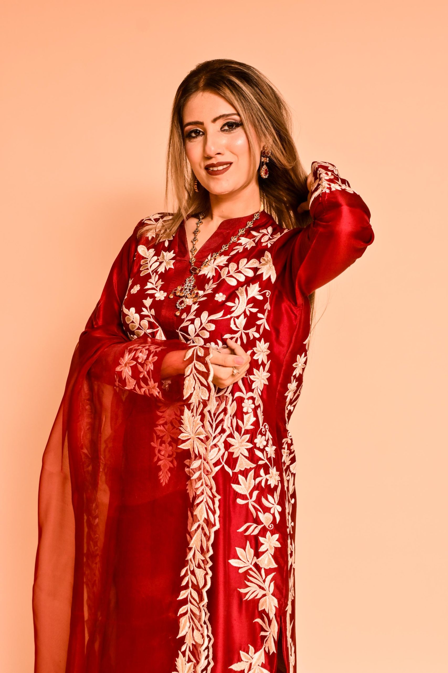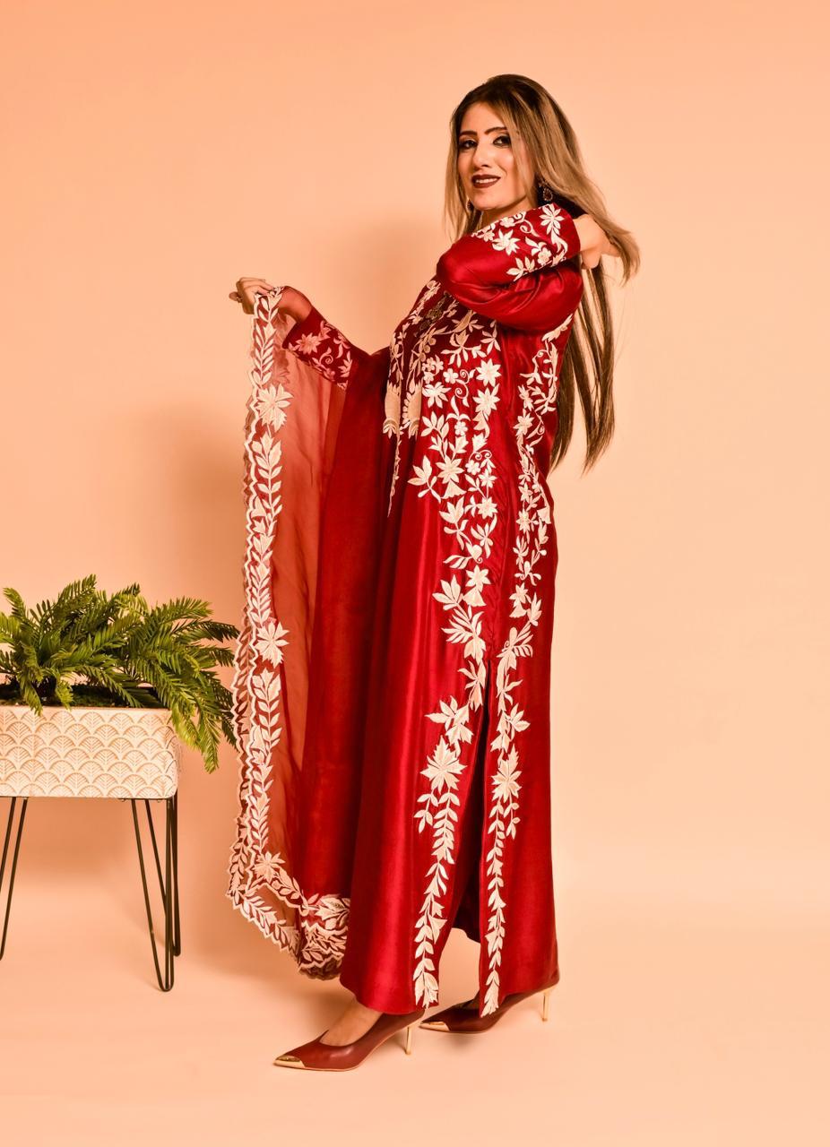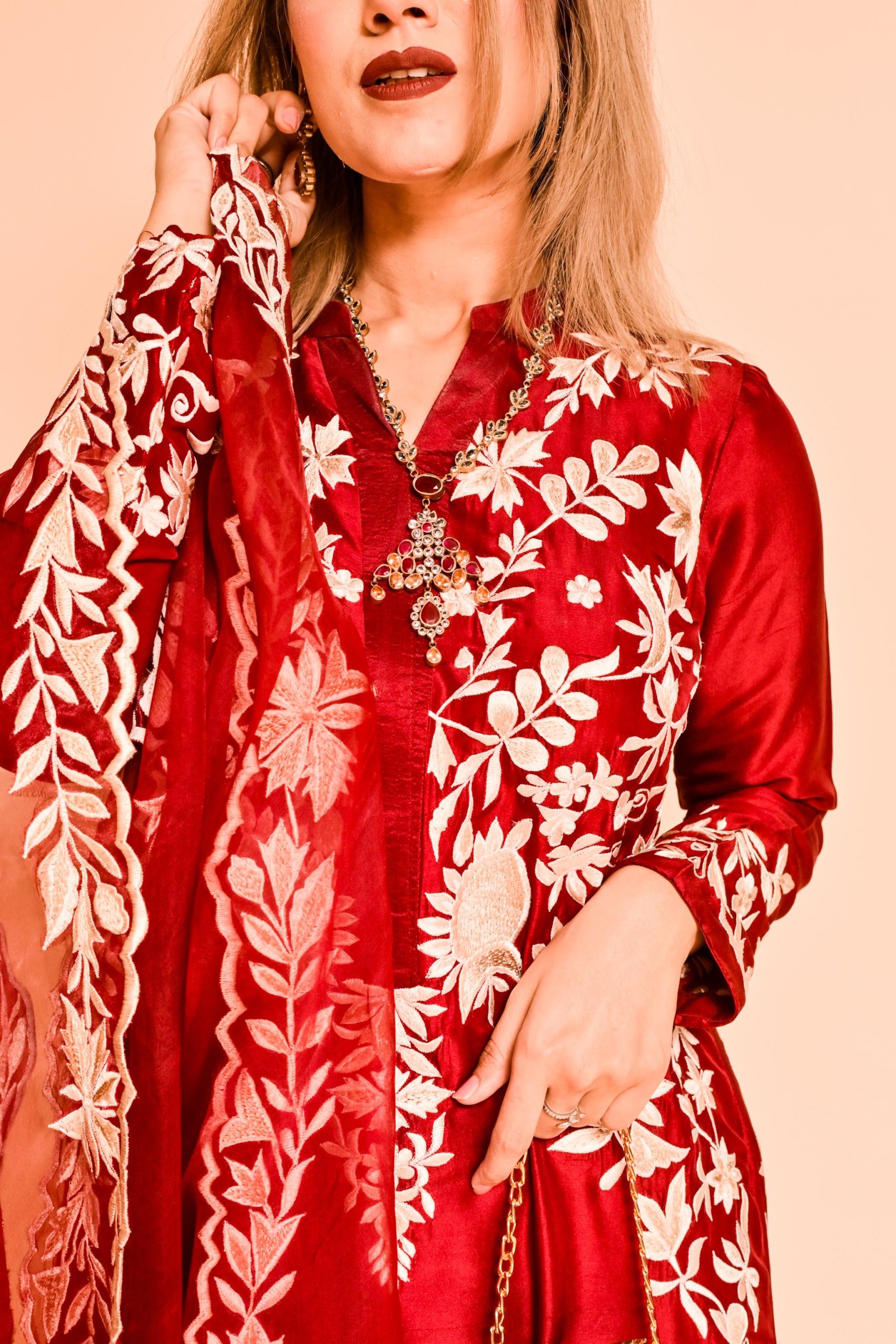 The Crimson Arabesque is a timeless formal ensemble crafted in pure raw silk, designed to embody regal elegance with a Middle Eastern flair. Inspired by intricate Arabic motifs, this deep crimson outfit features flowing vine and floral embroidery in soft ivory threads, artfully placed along the front panel, sleeves, and borders. The look is completed with a matching organza dupatta, adorned with arabesque-inspired embroidered edges that lend a touch of sophistication and grace. Ideal for festive occasions, weddings, or formal evenings, this piece captures the essence of traditional artistry fused with contemporary allure.